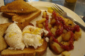 Breakfast was poached eggs on whole wheat toast with a side of crispy homefries. I had OJ. Gary had coffee.