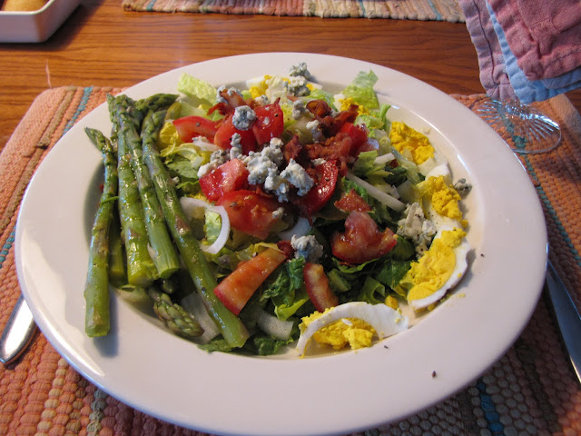 Jenny came for dinner. It was just what I wanted! Romaine, marinated asparagus, onion, tomato, crumbled bacon, hard boiled eggs and crumbly blue. A biggasalad.