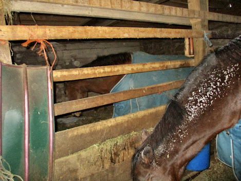 They stayed out for about an hour and a half while I finished chores and did more shoveling, then I set up their stalls with hay and water and put them back in.