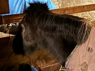 The ponies were tuned in to some shooting on the road behind us and it took awhile to get them to come in for dinner. The pasture looks like a disaster area.
