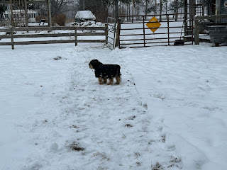 I had just enough time to cut up some carrots, grabbed the beet pulp and went out for evening chores. Rebel and Buddy were in the snow all day. They prefer to hang out behind the grooming room so they can get out of the wind.