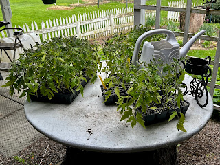Gary took the car down for an oil change and tire rotation and on the way home he stopped at Sara's Nursery to pick up a couple of hanging plants for the porches. He got a few other things and 3 flats of the San Marzano tomatoes that were grown from last year's seeds (that were in the greenhouse there). We are finding homes for some of them.